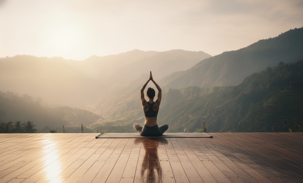 The morning begins quietly with a gentle yoga session, surrounded by tropical vegetation — a grounding way to reconnect body and breath before heading out.