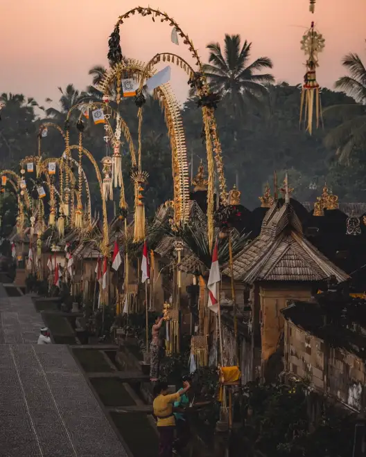 In the days leading up to Galungan, families prepare offerings, cook traditional dishes, and decorate their homes and temples. One of the most striking visual elements is the penjor — tall, gracefully curved bamboo poles adorned with coconut leaves, fruits, flowers, and symbolic ornaments. Lining the streets, they transform villages into ceremonial avenues of devotion and artistry.